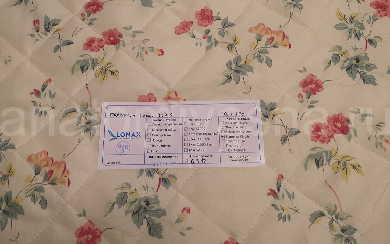 Приветствуем Вас в нашем интернет-магазине «Анатомия сна». Сегодня я расскажу Вам про наматрасник Lonax LX 5. Фабрика по производству продукции товаров и аксессуаров для сна Lonax (Лонакс), начала свою деятельность в 2007 году. За все это время бренд Lonax, зарекомендовал себя с хорошей стороны и нашёл своего покупателя. Универсальный наматрасник Lonax LX 5 подойдет для любой поверхности. В его состав входит высокоэластичная LX пена нового поколения, которая обладает более выраженными эргономическими свойствами. Это искусственный наполнитель, который сочетает в себе анатомические свойства и комфортную поддержку, то есть поддерживает позвоночник и при этом подстраивается под все изгибы и вес тела. Экопена толщиной 4 см поможет расслабиться, крепче спать, избежать затеканий, придаст мягкость Вашему спальному месту. Этот тонкий матрас сделает старое спальное место заметно удобнее, а из-за эластичности материала, он легко сгладит небольшие неровности. Например, продавленные участки старого матраса или стыки дивана. Зафиксировать топпер на матрасе можно при помощи резинок, вшитых по углам изделия или липучками, которые расположены по периметру наматрасника. Чехол изготовлен из прочного и приятного на ощупь поликоттона — материал износостойкий, с оригинальным цветочным рисунком. Матрас LX-5 в вакуумной упаковке свернут на фабрике в компактный рулон. Скрученный вакуумный матрас удобно перевезти на дачу или просто забрать из магазина. Благодарим Вас за внимание, будем рады снова видеть Вас в нашем интернет-магазине «Анатомия сна».